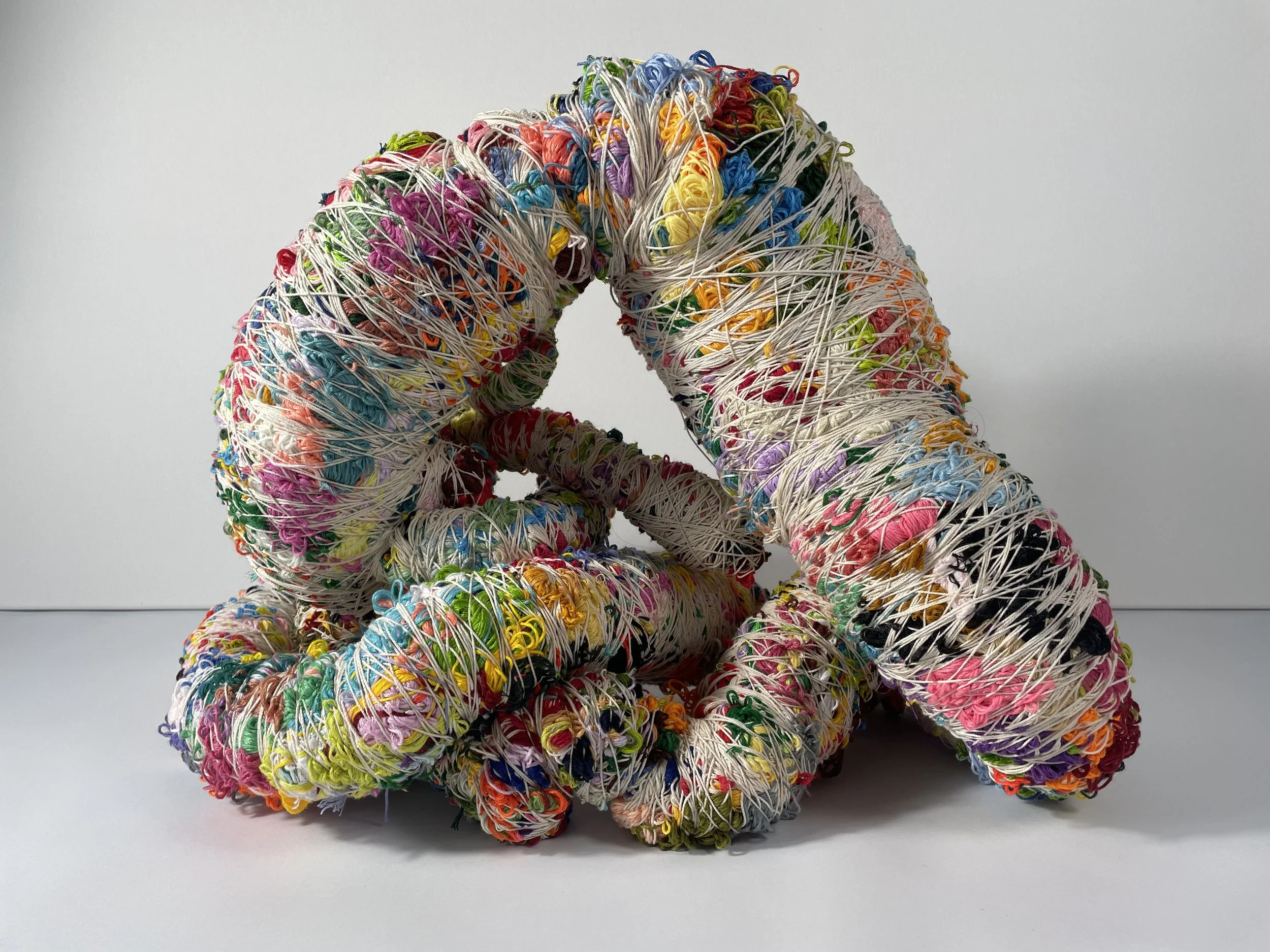 Audiences are invited to distort and manipulate the wrapped female figure located in the centre of the gallery space. Made of tightly wound embroidery thread and string, the materials used in Embroidery Thread and String (2023) allude to the downgrading of textiles and traditional female mediums such as embroidery in art history. At times the figure looks exhausted and is entirely at the behest of the viewers, lacking agency to decide the way in which it occupies space. The sculpture seeks to provoke a discussion around the links between labour, the female body and traditionally feminine materials.